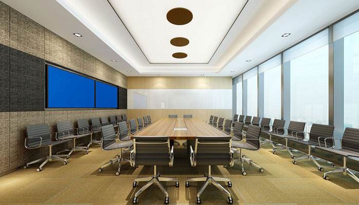2、会议室装修时地面不管是木地板还是瓷砖,最好再在上面铺一层地毯,这样可以起到降噪音的作用。像一些不需要统一着重的公司,即便不铺设地毯,也要确保选择的木地板或瓷砖具有一定的防滑特点,以免出现摔倒等尴尬情况。